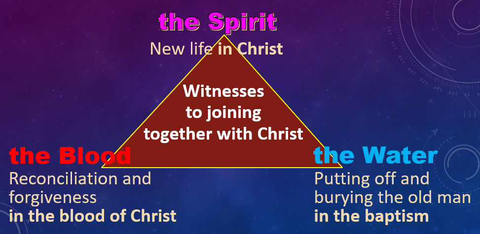 So there are three that bear witness on earth: the Spirit, the water and the blood; and these three agree as one. (1 John 5:8)