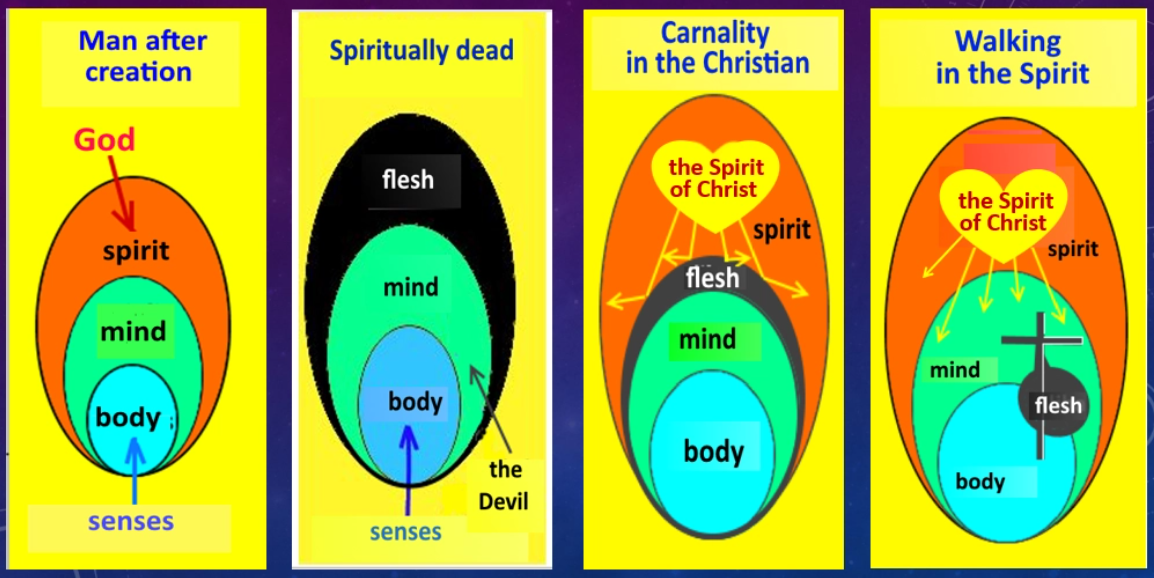 A human person is the trinity of spirit, mind and body. The position of the flesh in this whole can be described with diagrams:
