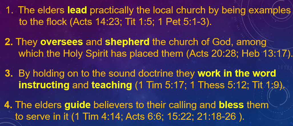 The Spirit of Jesus calls and appoints the elders in each new local church. Often a member of the eldership has one of the following permanent ministry positions given by Jesus: the ministry of apostle, prophet, evangelist, shepherd or the teacher (Eph 4:11), or they have a gift of grace closely related to it, e.g. administrating (1 Cor 12:28; Rom 12:8), prophesying (Rom 12:6) or teaching (Rom 12:7).