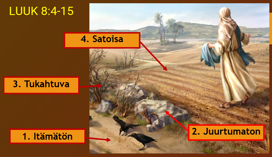 Jeesus sanoi: "Se, mikä on hyvässä maassa, tarkoittaa niitä, jotka sanan kuultuaan säilyttävät sen vilpittömässä ja hyvässä sydämessä ja kestävinä tuottavat satoa." (LUUK 8:15)