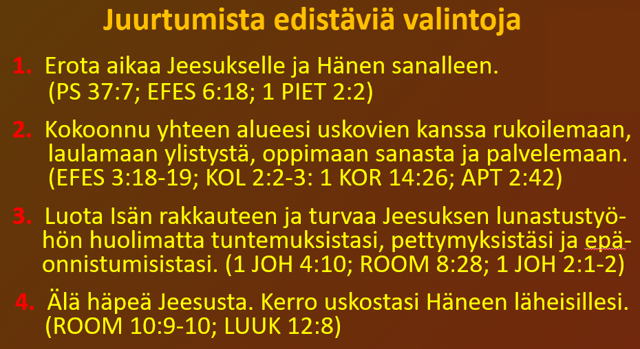 Kasvaminen Jeesuksen armossa ja tuntemisessa on tärkeätä sen vuoksi, että seurakunnan viimeiset vuodet ennen Jeesuksen paluuta ovat hankalia aikoja (MARK 4:17). Antikristillinen arvomaailma ja opilliset eksytykset pyrkivät kaikin keinoin irrottamaan juuremme uskomme perustukselta: