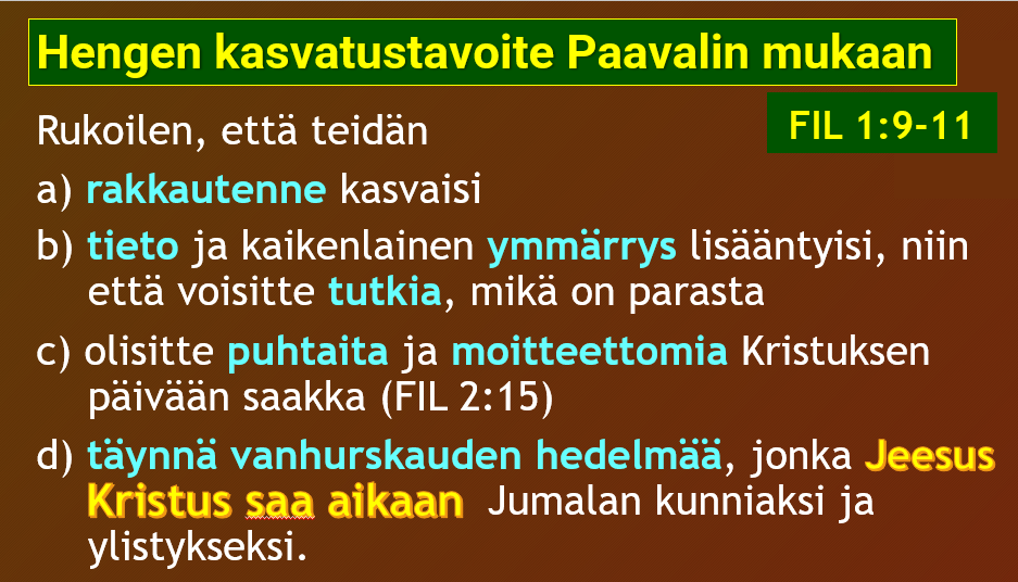 Täyttykää Hengellä! (EFES 5:18) Tässä kreikan verbimuoto pleróō = "täyttykää" on passiivin imperatiivin preesens, mikä tarkoittaa: "antakaa Hengen, eli Kristuksen mielen, jatkuvasti täyttää itsenne."